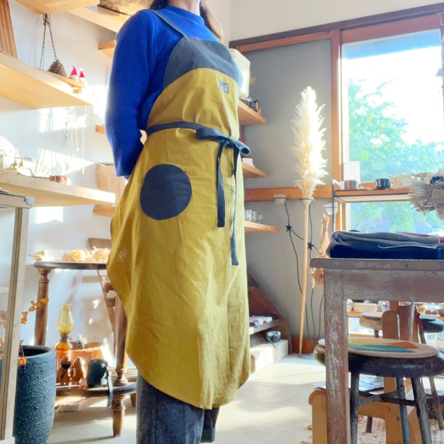 ご覧いただきありがとうございます。 こんなエプロンあったら面白いなぁを形にしました。 直径90cmの丸◯と直径40cm丸◯をくっつけたような形のエプロンです。 〈カラー〉 黒、グレー、マスタードなど 〈サイズ〉 モデルの身長160cm 丈約100cm 身幅約90cm(一番広いところ) 〈素材〉 シワ加工コットン100%(国産) 基本的にフリーサイズですが、オーダー承ります。 但し、真円型なので、身幅を広くすると同時に丈も長くなります。そして、丈を長くすると身幅も広くなります。 オーダーされる際はご購入前にメッセージでお問い合わせください。その他、色のオーダーも承ります。