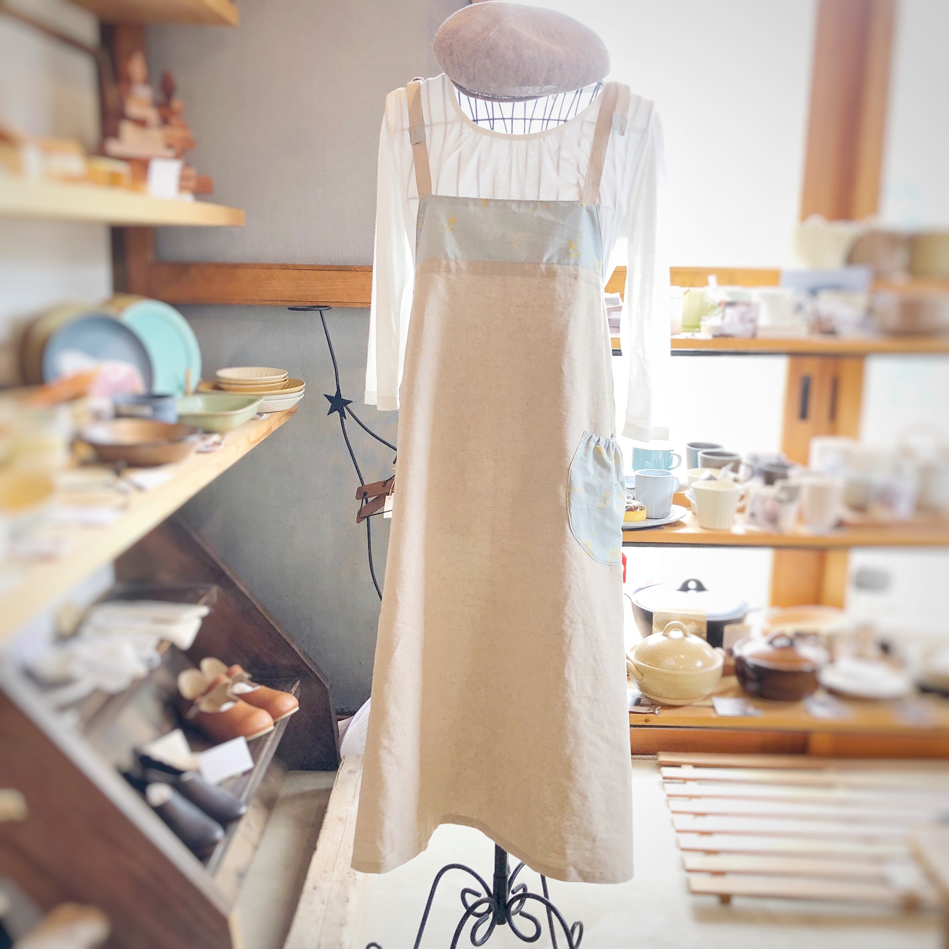 前も後ろもかわいい、着こなし二通り、いえいえ結び目を前に持ってきたら着こなし4通りのワンピースエプロンです。