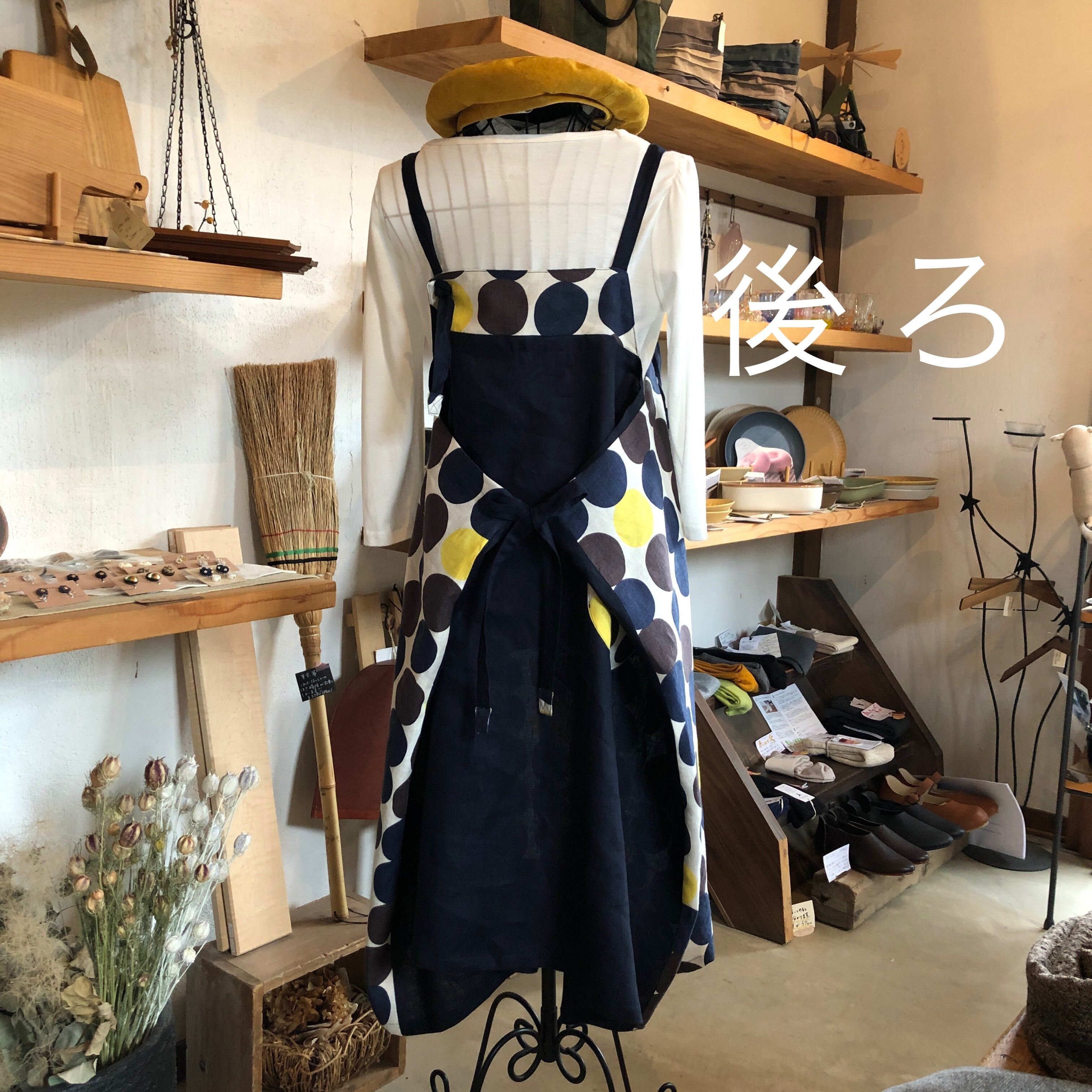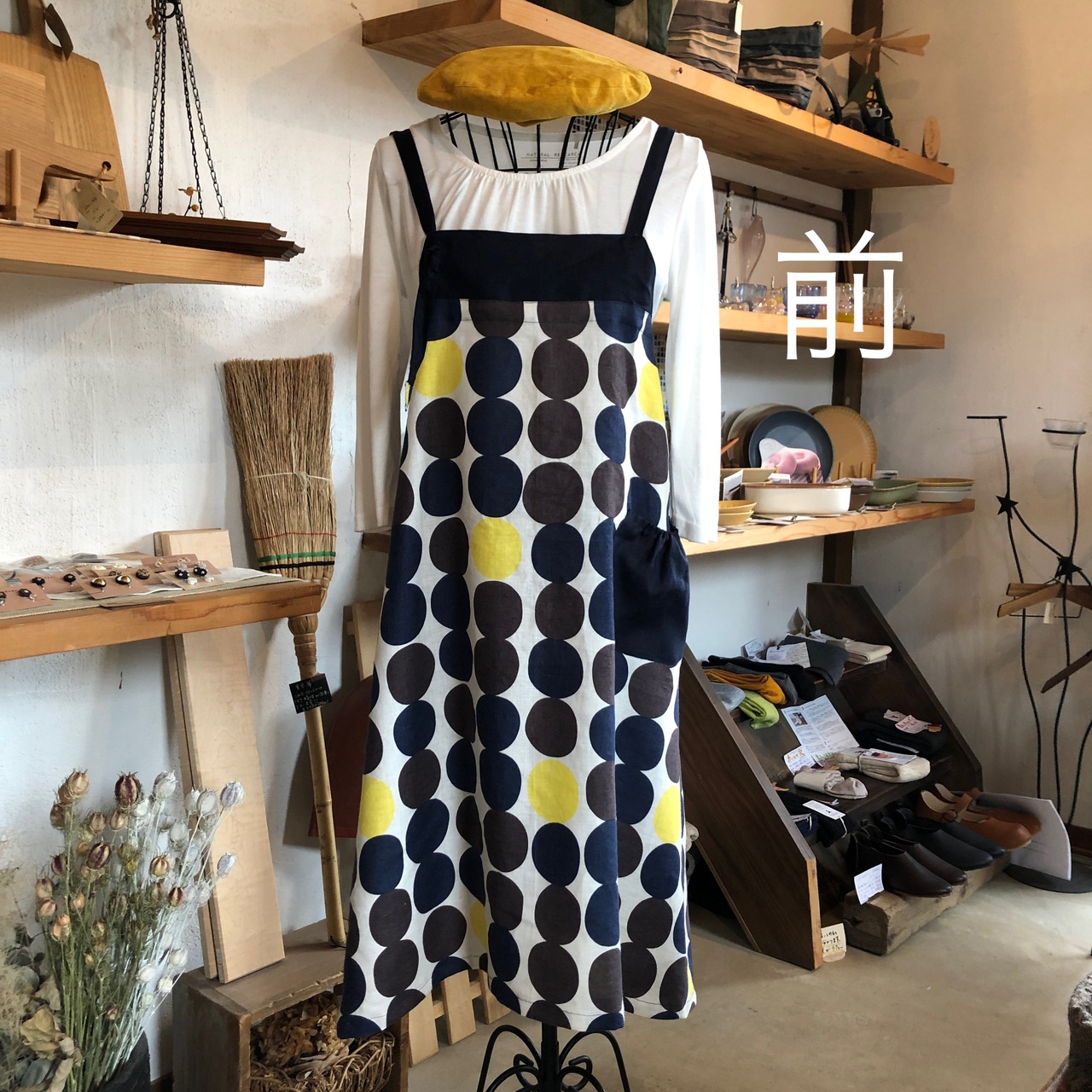 前も後ろもかわいい、着こなし二通り、いえいえ結び目を前に持ってきたら着こなし4通りのワンピースエプロンです。