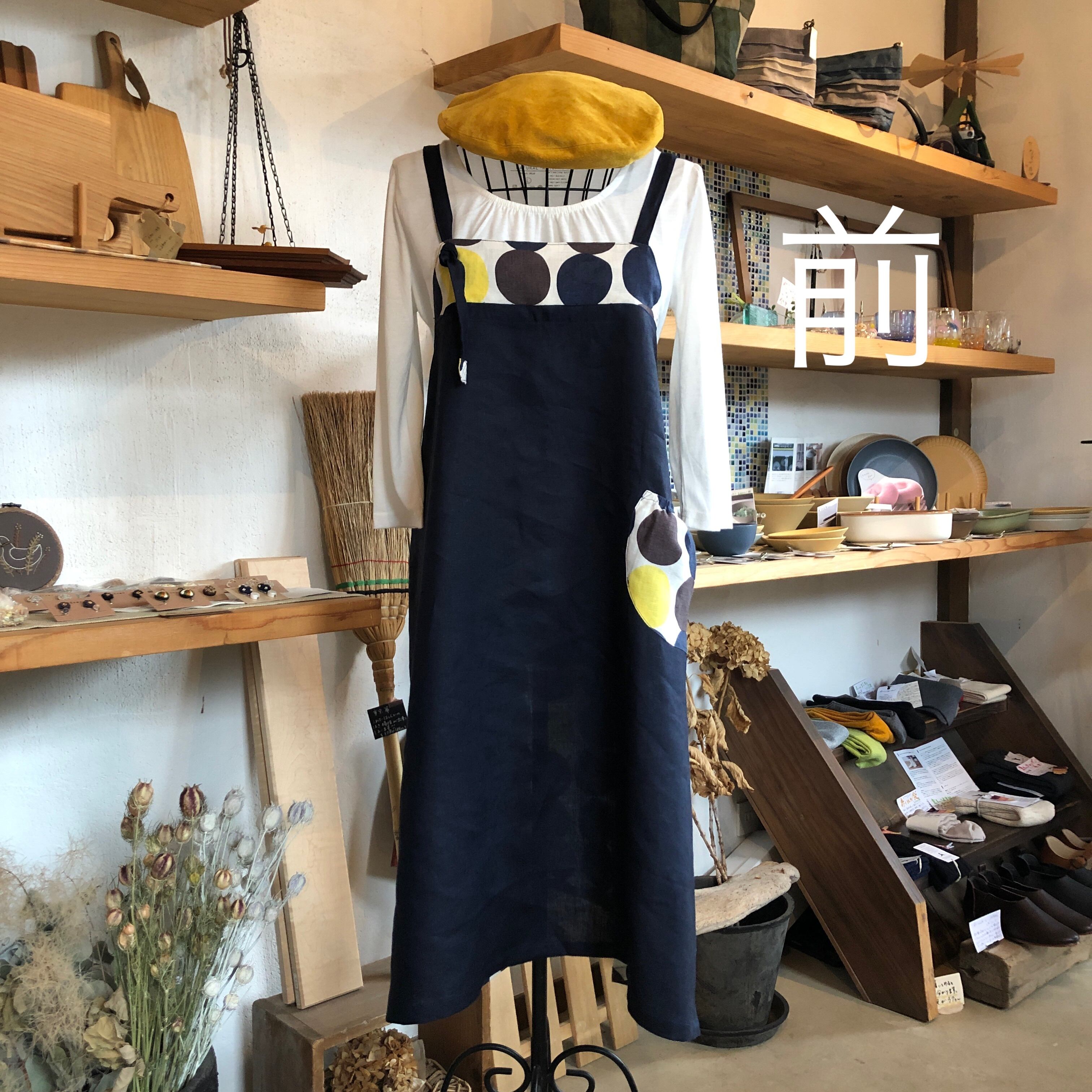 素材は麻(国産)です。着丈は115㎝ですが、肩紐を調節できるので基本的にフリーサイズ。