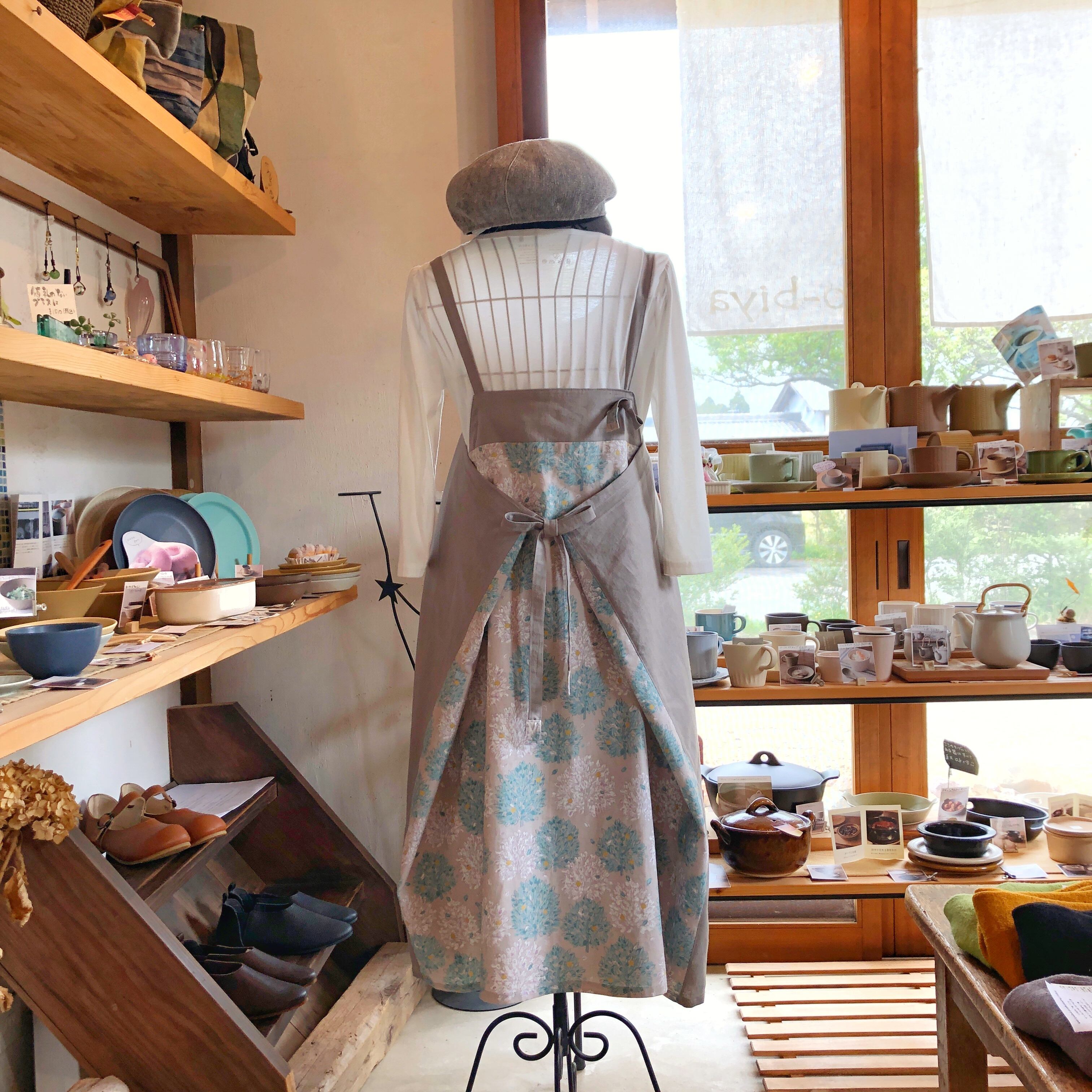前も後ろもかわいい、着こなし二通り、いえいえ結び目を前に持ってきたら着こなし4通りのワンピースエプロンです。
