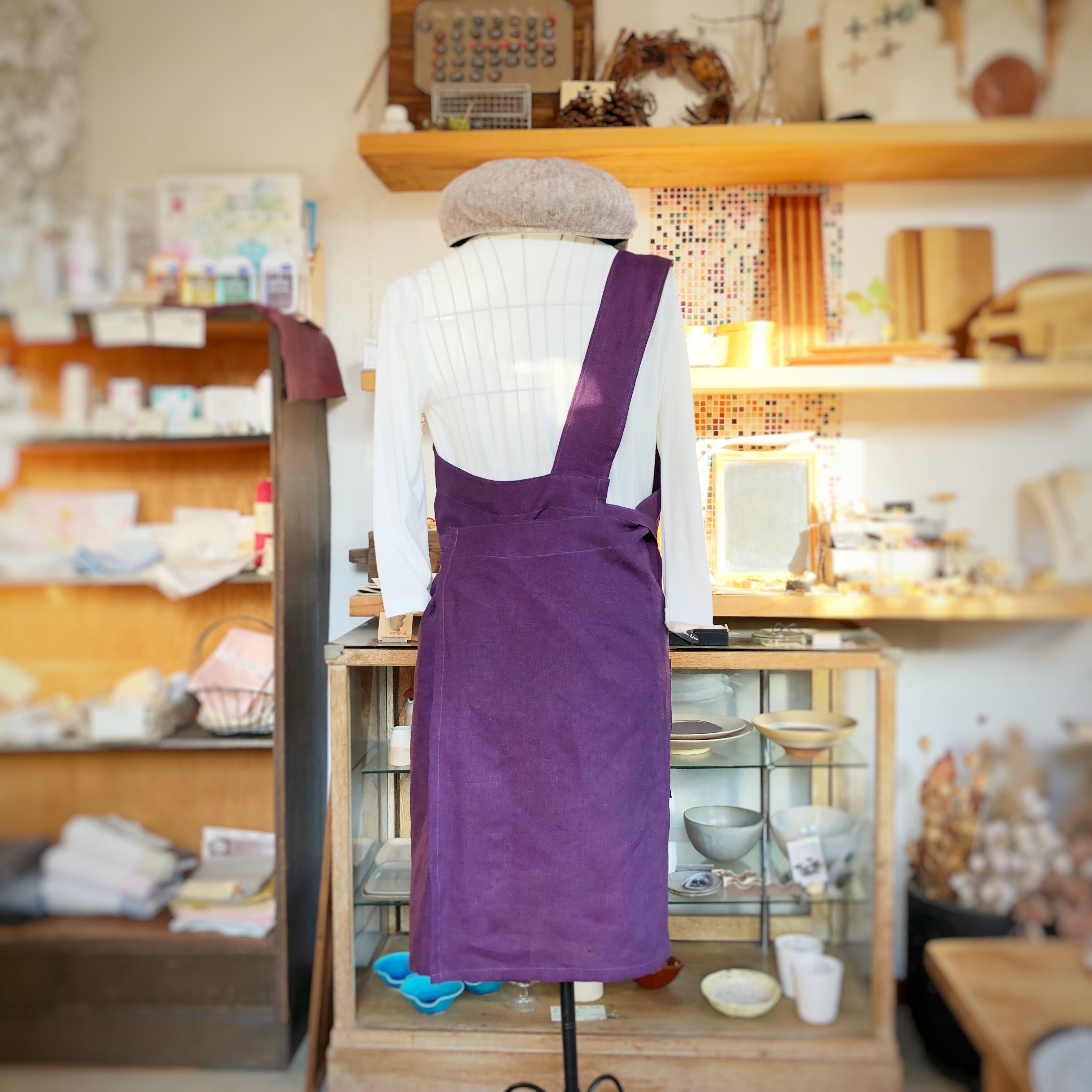 肩のところで長さ調節できるリネンのワンショルダーエプロンです。