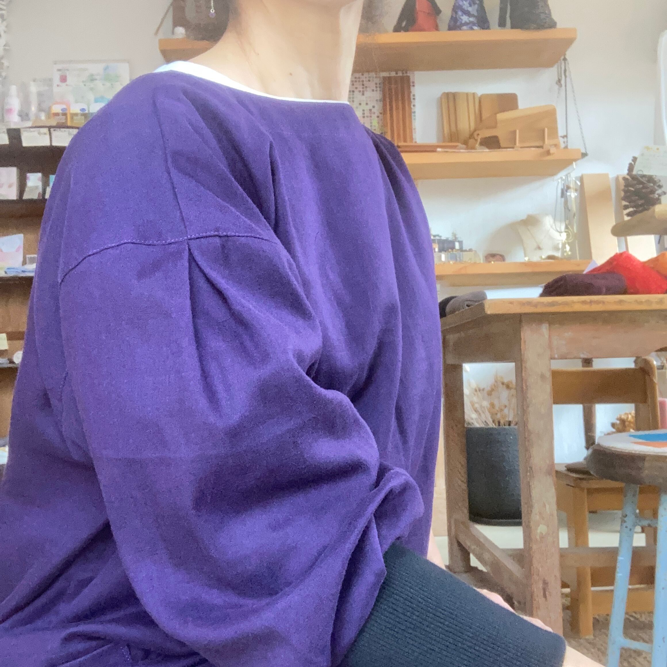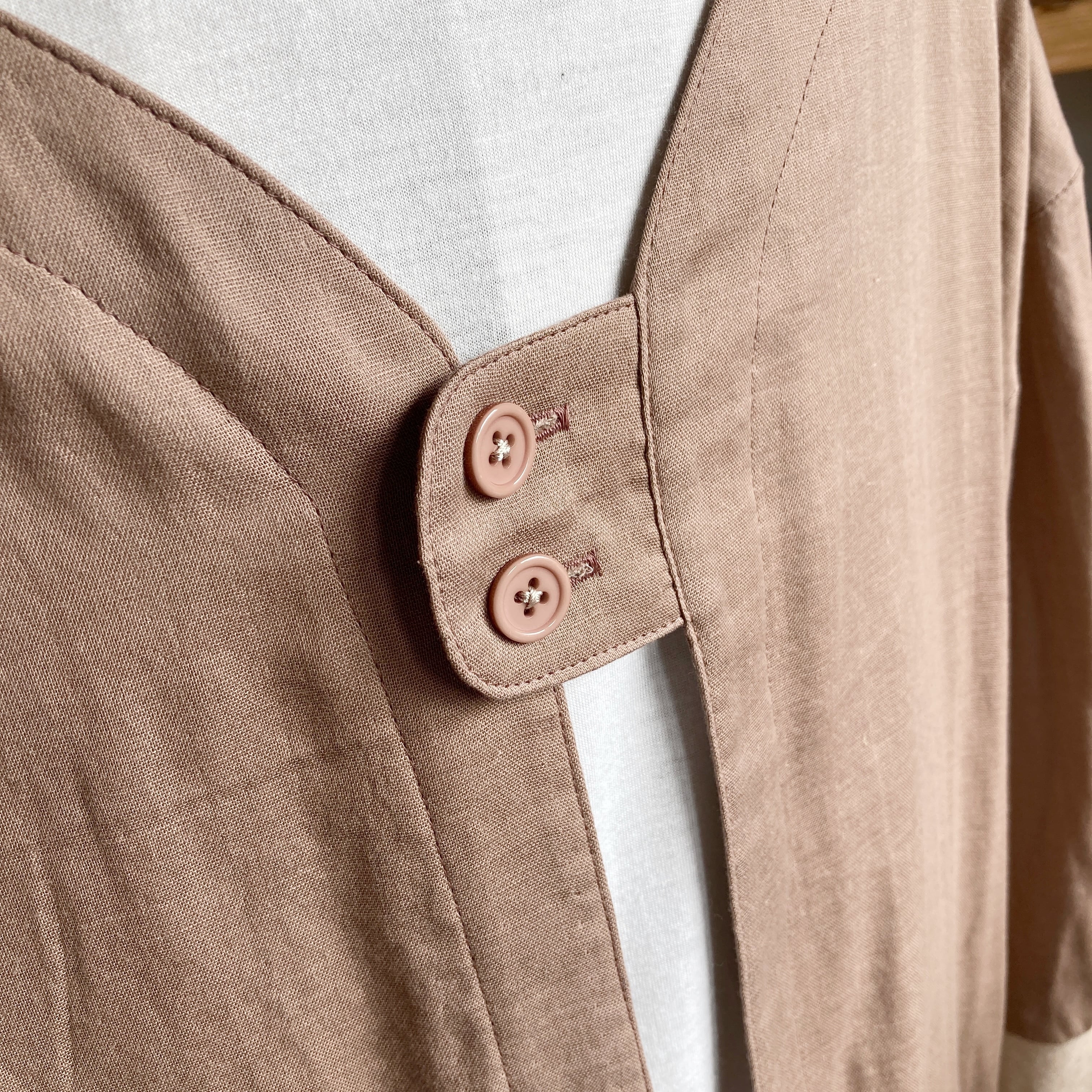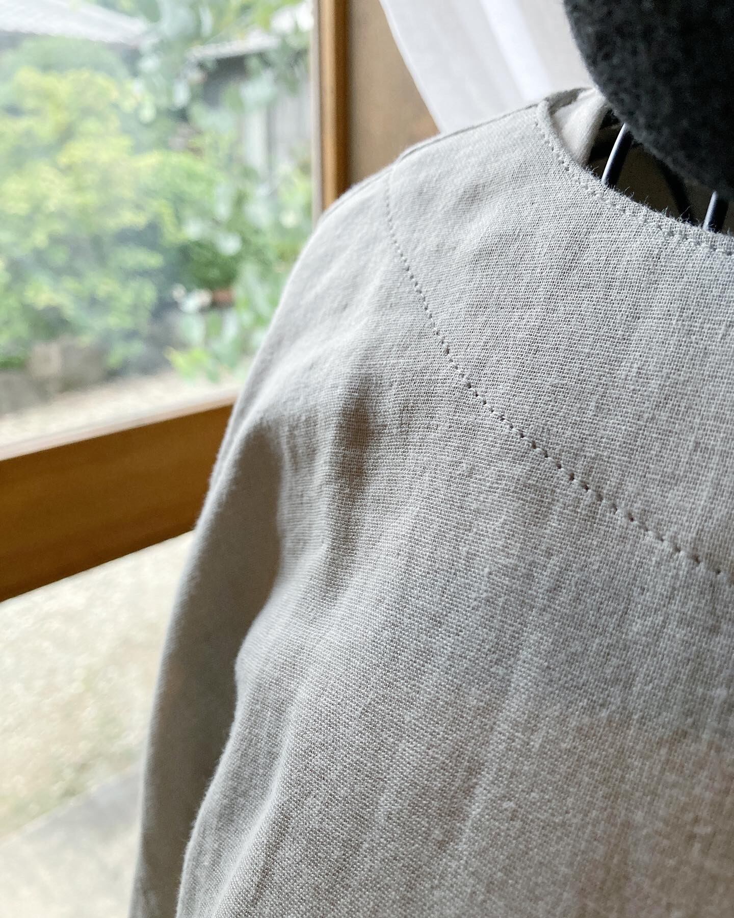 そして、今回はリネンではなくダブルガーゼでソフトな仕上がりの割烹着を作りました。袖口のリブも柔らかいニット生地を使っています。