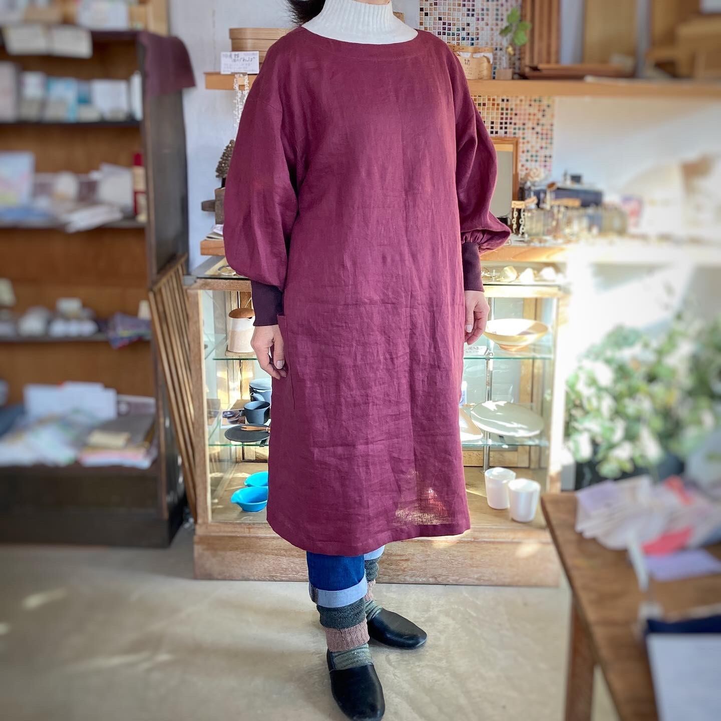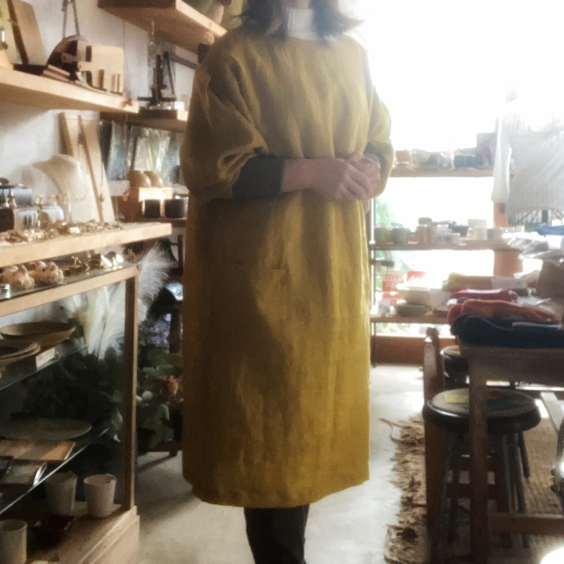 とはいえ、ワンピースとしても着られます。割烹着は背中が寒いという声を聞き、紐なしにしてしまおうということで、ワンピースになりました。