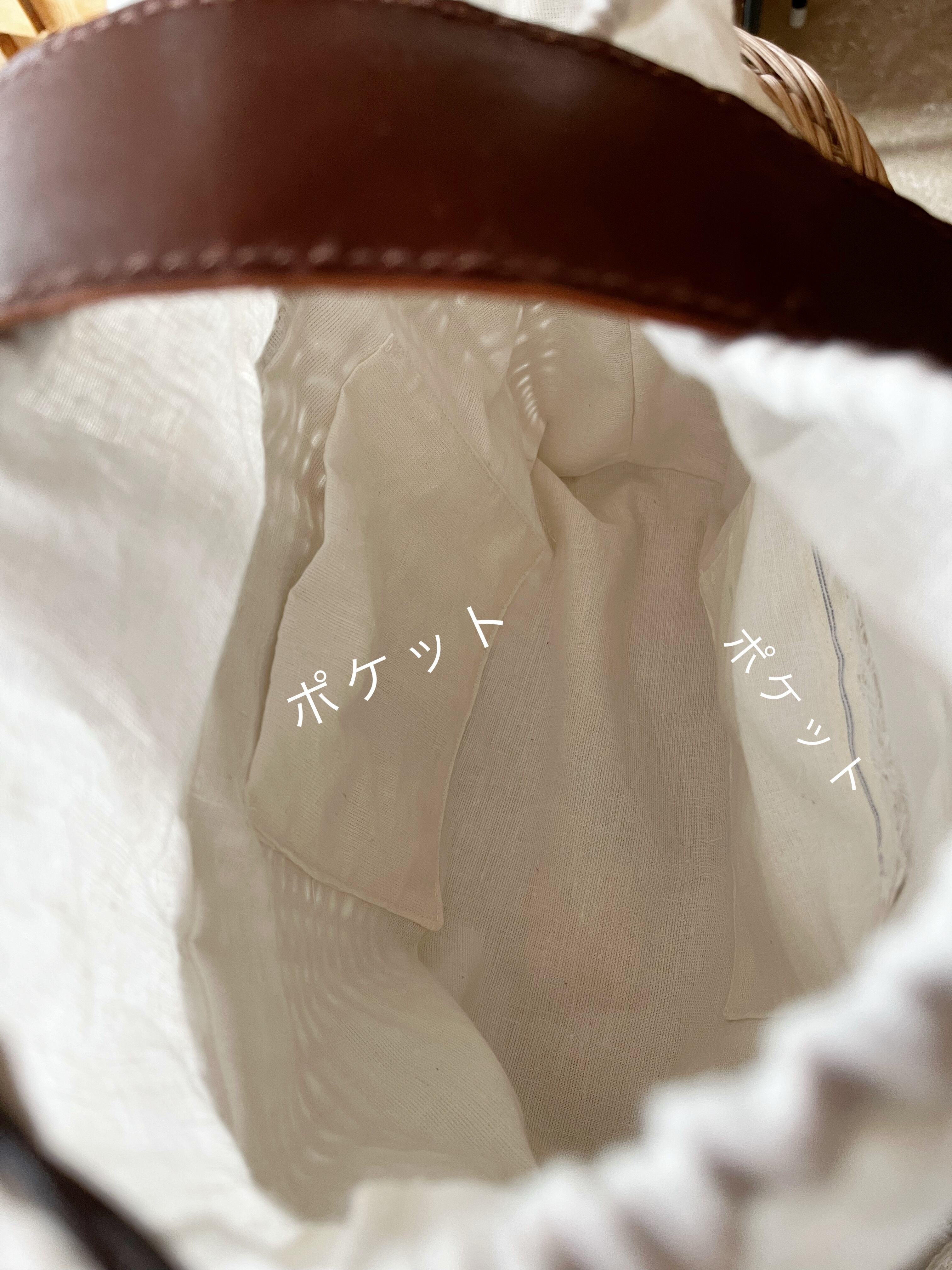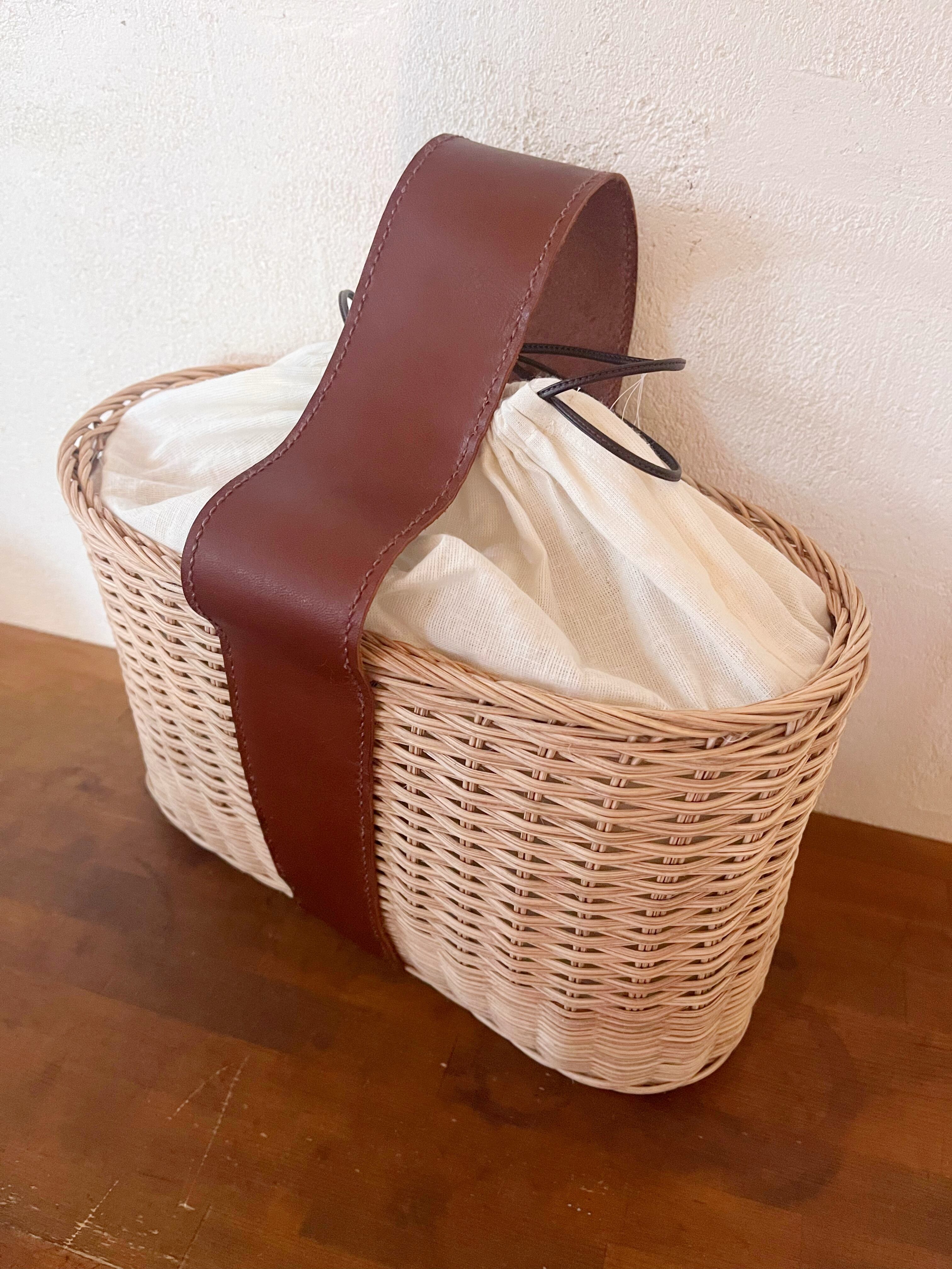 藤で丁寧に編まれた籠に太い革ベルトを縫い付け、内側に巾着袋をつけました。